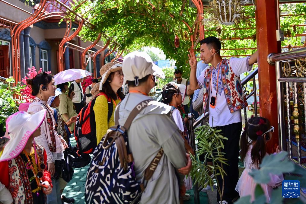 游客在新疆伊犁哈萨克自治州伊宁市伊犁老城喀赞其文化旅游区家访点参观(7月23日摄)。