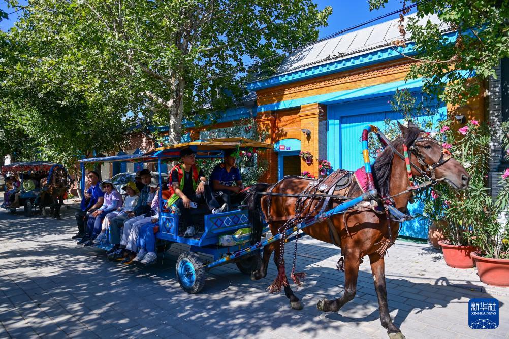 游客在新疆伊犁哈萨克自治州伊宁市伊犁老城喀赞其文化旅游区乘坐马车观光游览(7月23日摄)。