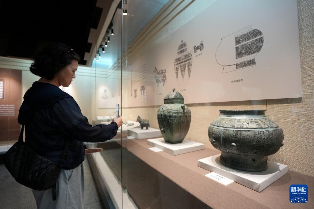 7月22日,游客在汉中市博物馆参观汉中境内出土的青铜器。