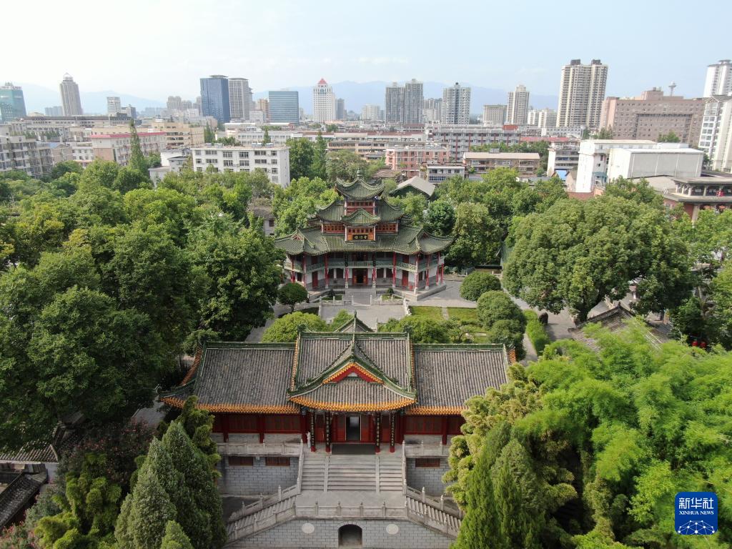 北倚秦岭的汉中古汉台遗址(7月21日摄,无人机照片)。