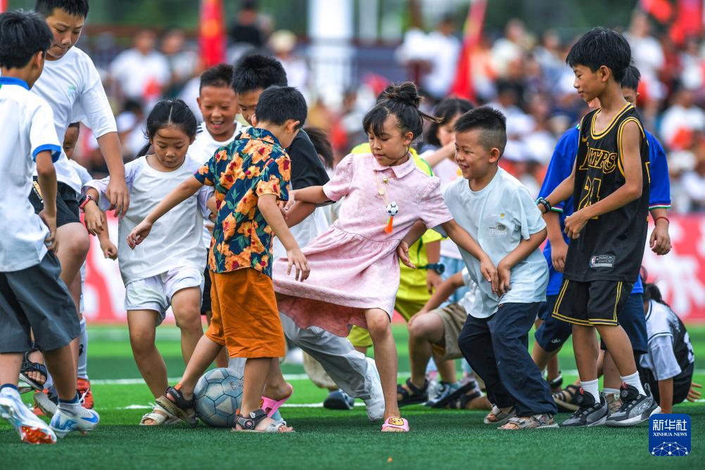 7月26日,孩子们在榕江"村超"球场比赛间隙踢球。