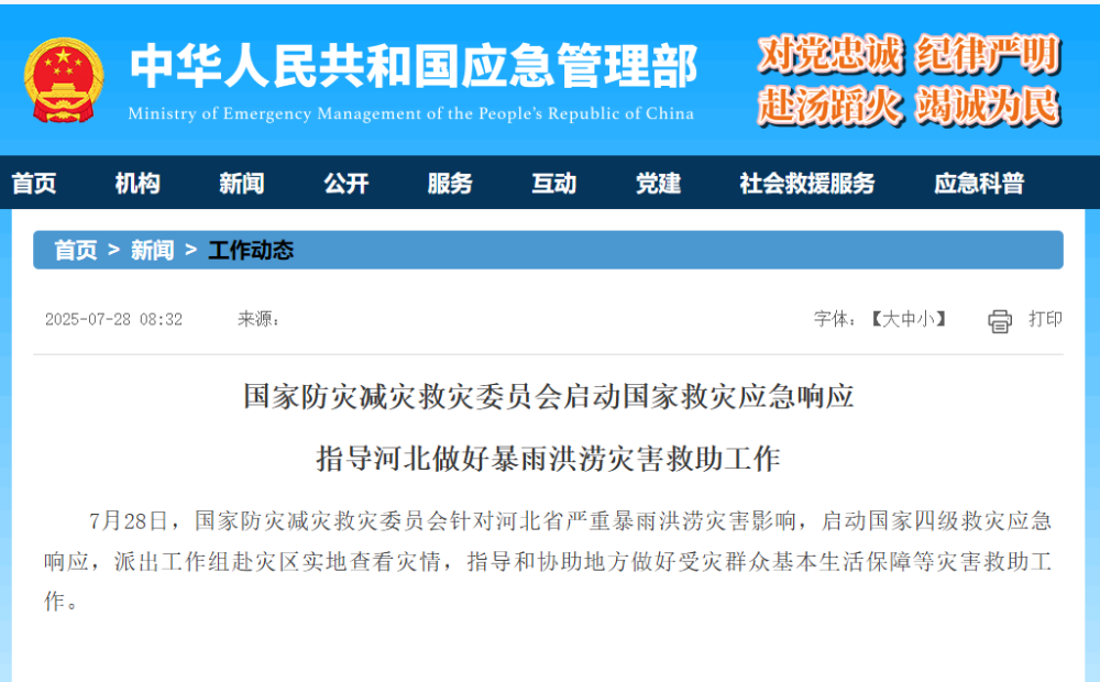 国家防灾减灾救灾委员会启动国家救灾应急响应 指导河北做好暴雨洪涝灾害救助工作