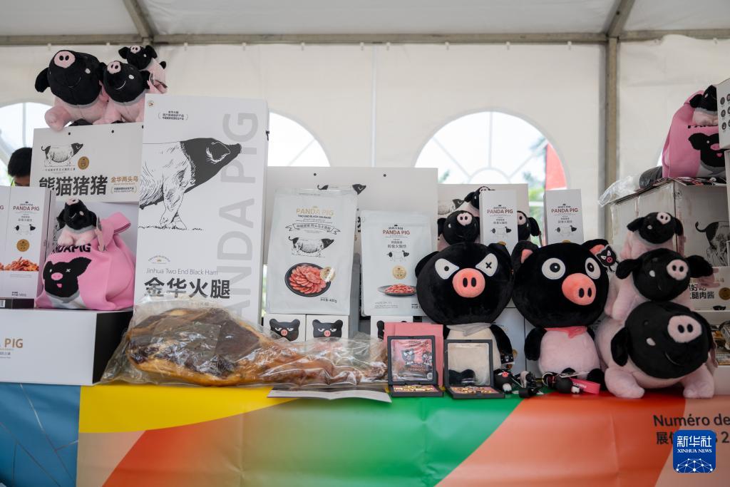 这是7月24日在加蓬首都利伯维尔举行的中国-加蓬商品展览会上拍摄的金华火腿和金华两头乌文创周边产品。
