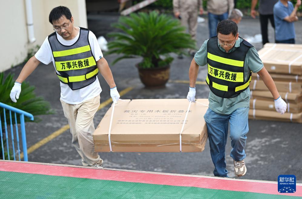 7月28日,救援人员在天津市蓟州区下营镇初级中学安置点搬运床铺。