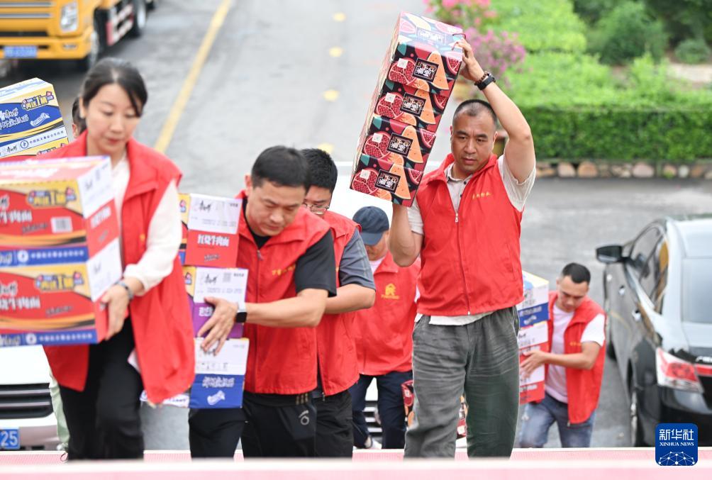 7月28日,志愿者在天津市蓟州区下营镇初级中学安置点搬运物资。