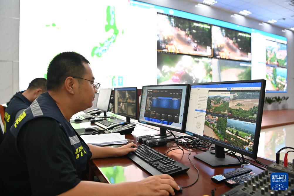 7月28日,工作人员在蓟州区应急指挥部值守。