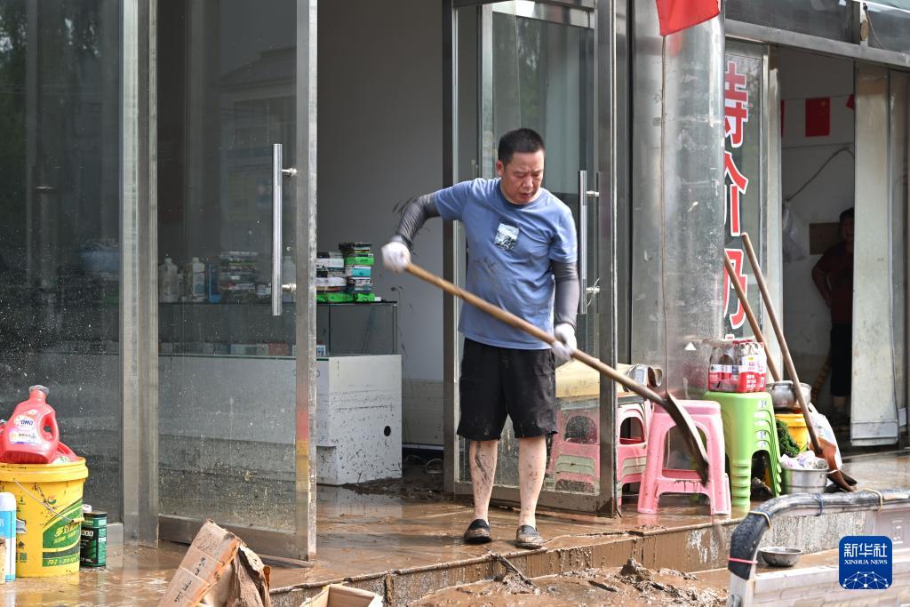 7月28日,居民在天津市蓟州区下营镇下营村清理屋内的淤泥。
