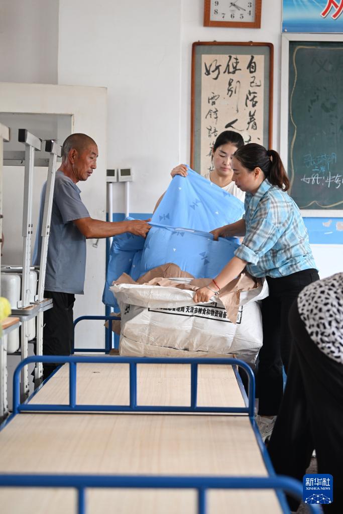 7月28日,人们在天津市蓟州区下营镇初级中学安置点铺设被褥。