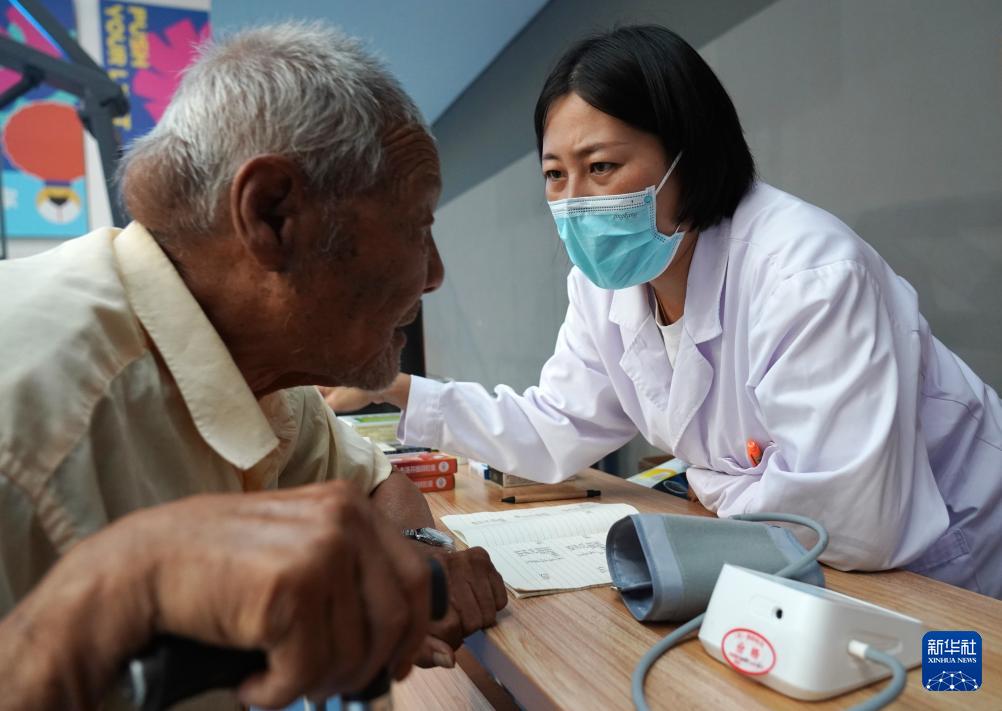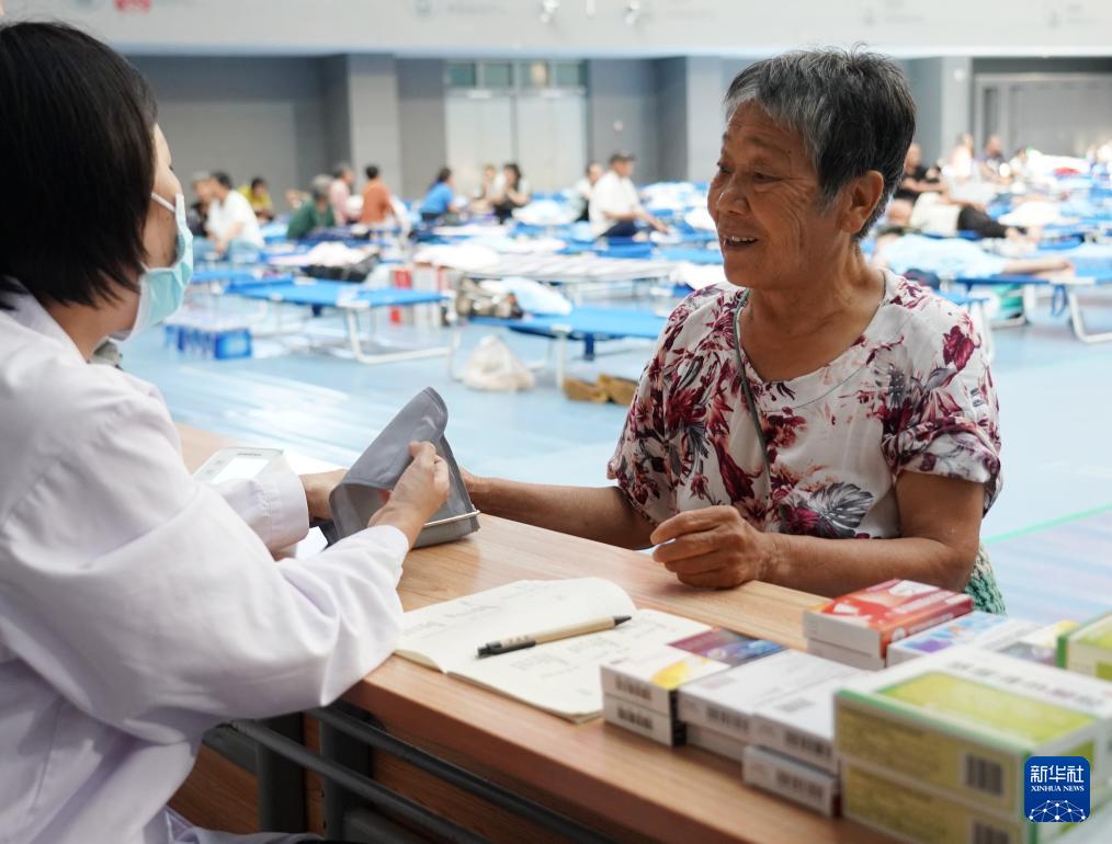7月29日,在北京市平谷区体育中心安置点,来自大兴庄镇社区卫生服务中心的医务人员为老人提供医疗帮助。