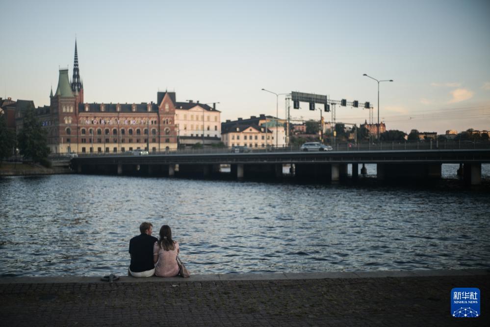 7月25日,在瑞典斯德哥尔摩,一对情侣在水边休息。
