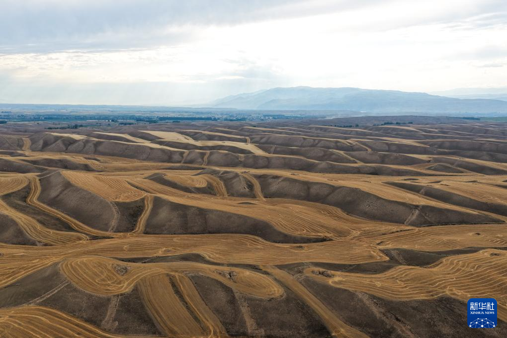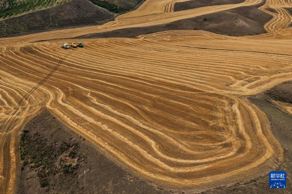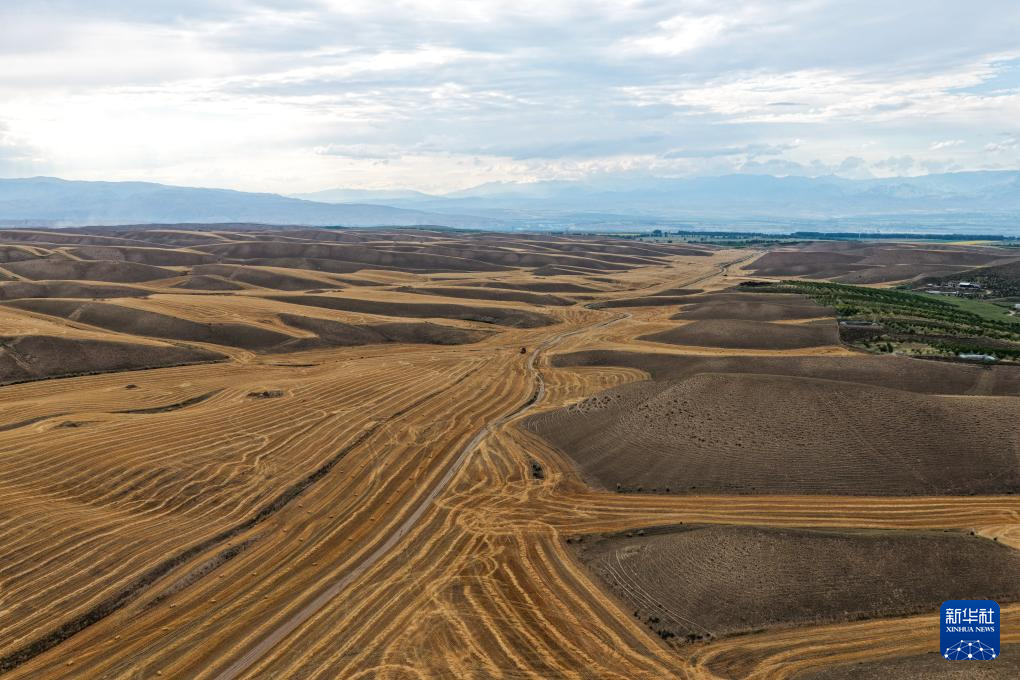 近日,在位于天山北麓的新疆维吾尔自治区伊犁哈萨克自治州特克斯县,成熟的小麦迎来收获。当地农民抢抓有利天气,开展夏收工作。