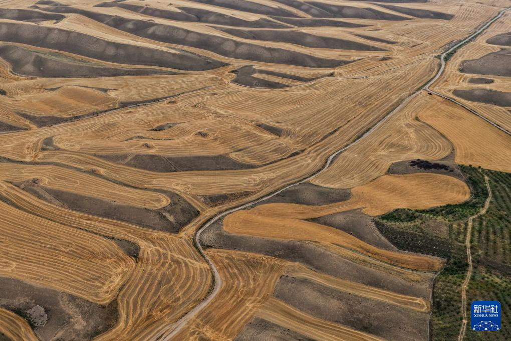 这是7月31日在新疆伊犁特克斯县乔拉克铁热克镇拍摄的麦田(无人机照片)。