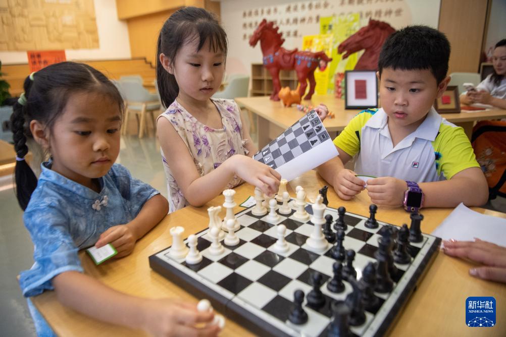 7月31日,小朋友在重庆市两江新区大竹林街道竹林社区学院举办的文化艺术游园会活动上学习国际象棋。