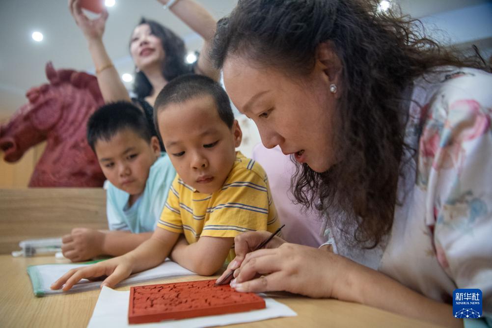 7月31日,在重庆市两江新区大竹林街道竹林社区学院举办的文化艺术游园会活动上,工作人员刘翰音(右一)向小朋友展示雕漆技艺。