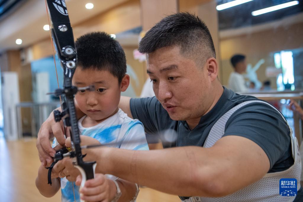 7月31日,在重庆市两江新区大竹林街道竹林社区学院举办的文化艺术游园会活动上,小朋友在工作人员尹占旭(右)的指导下体验射箭。