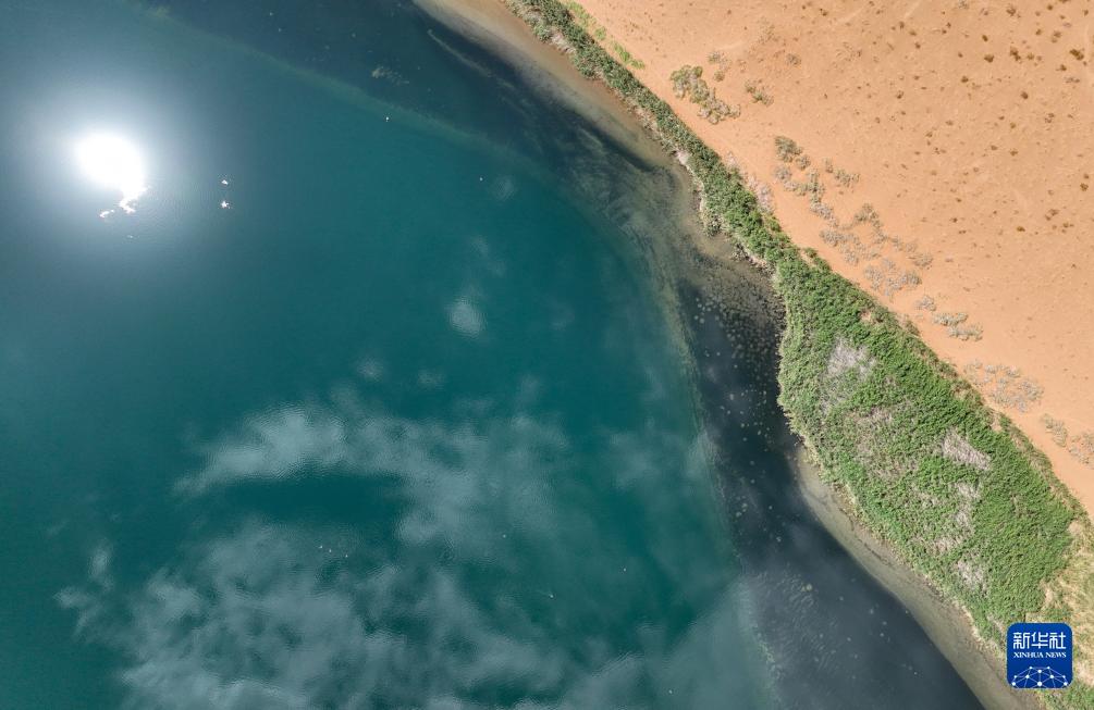2024年7月31日在内蒙古阿拉善盟阿拉善右旗拍摄的巴丹吉林沙漠中的湖泊(无人机照片)。
