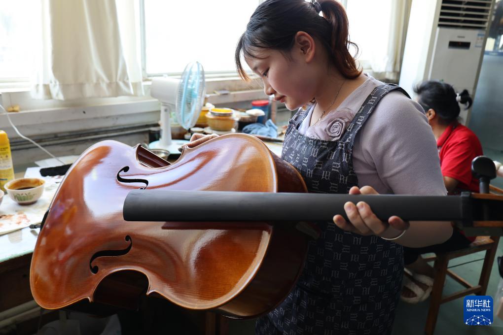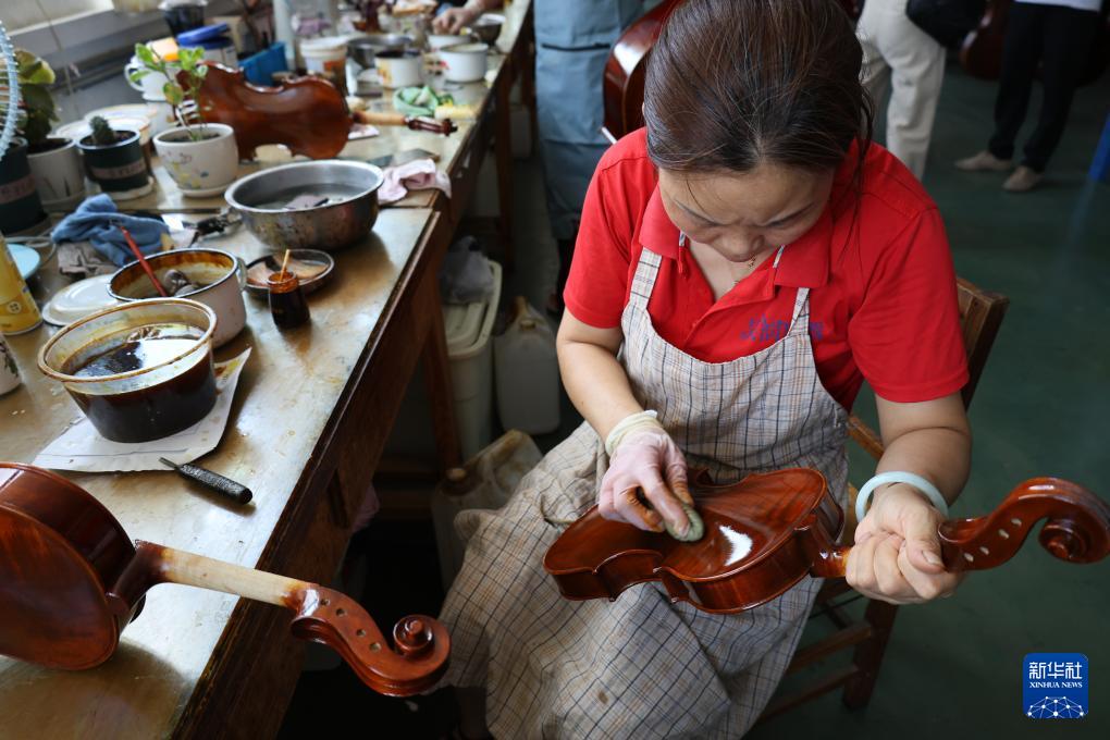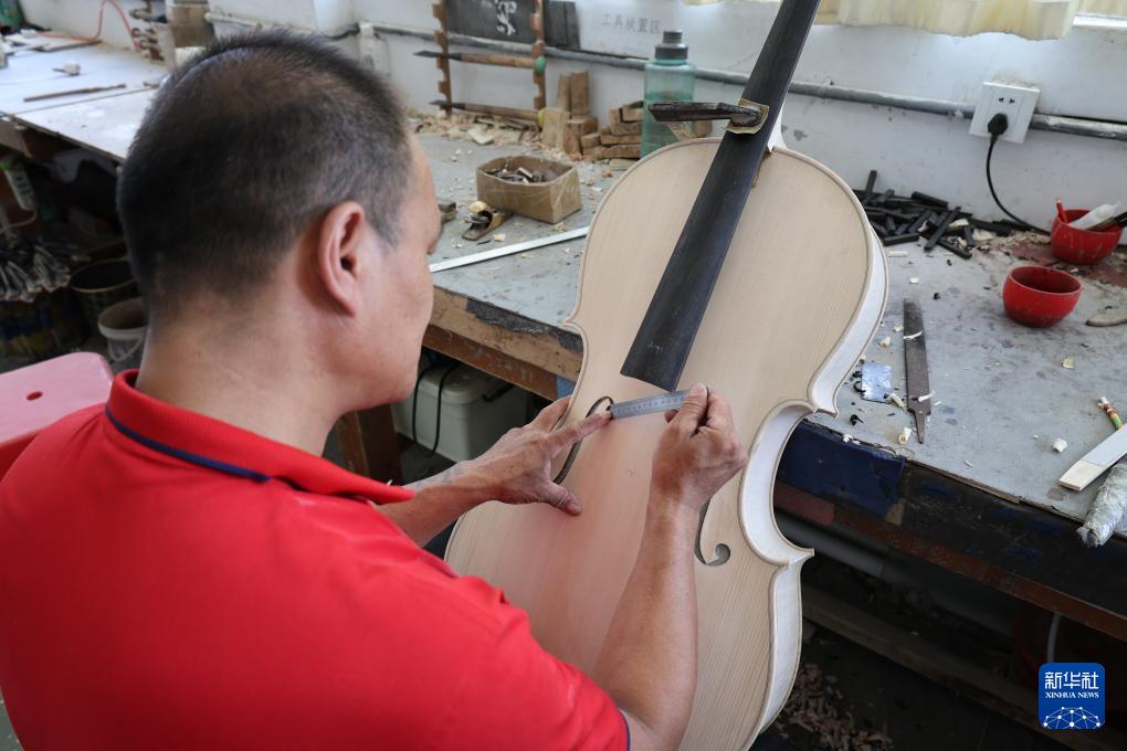7月24日,在河南省驻马店市确山县的确山提琴产业园,一名工人在一家企业的工作室内制作提琴。