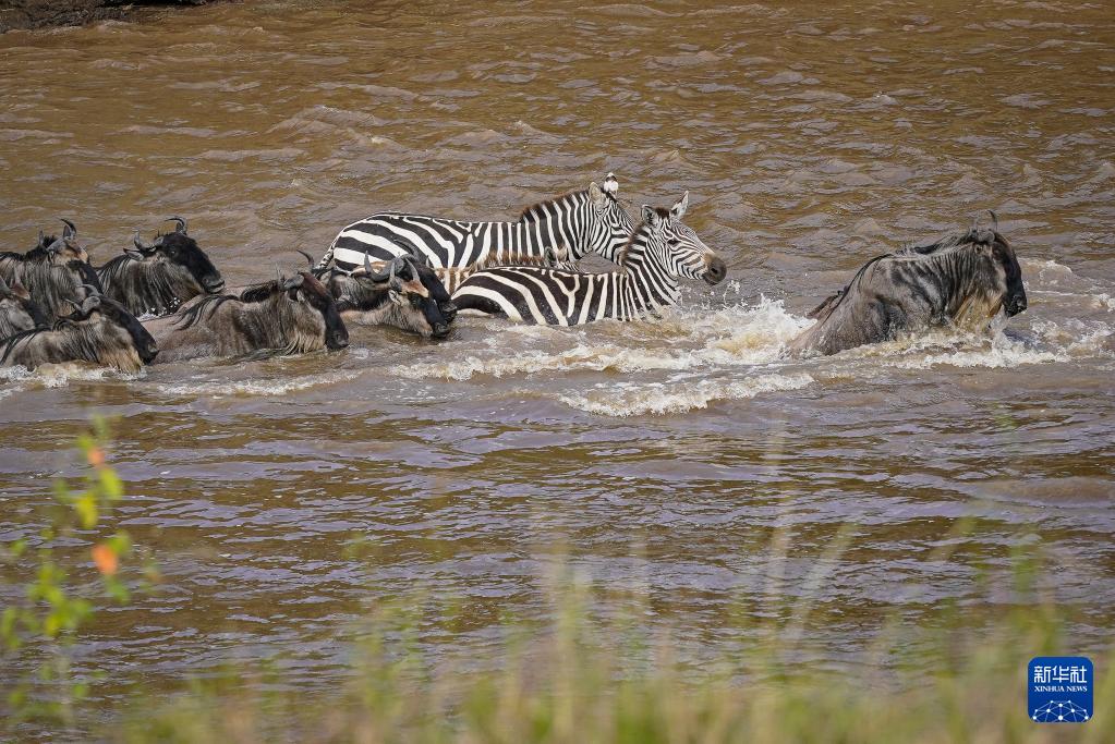 7月30日,在肯尼亚马赛马拉国家保护区,角马和斑马渡过马拉河。
