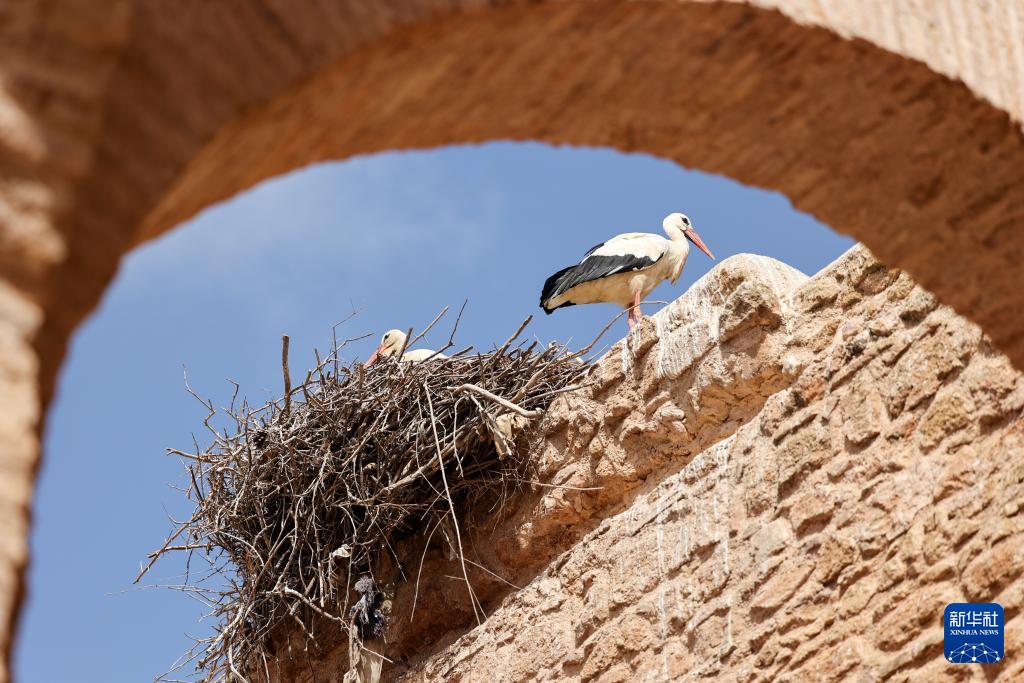这是8月1日在摩洛哥首都拉巴特拍摄的栖居在舍拉考古遗址的鹳鸟。
