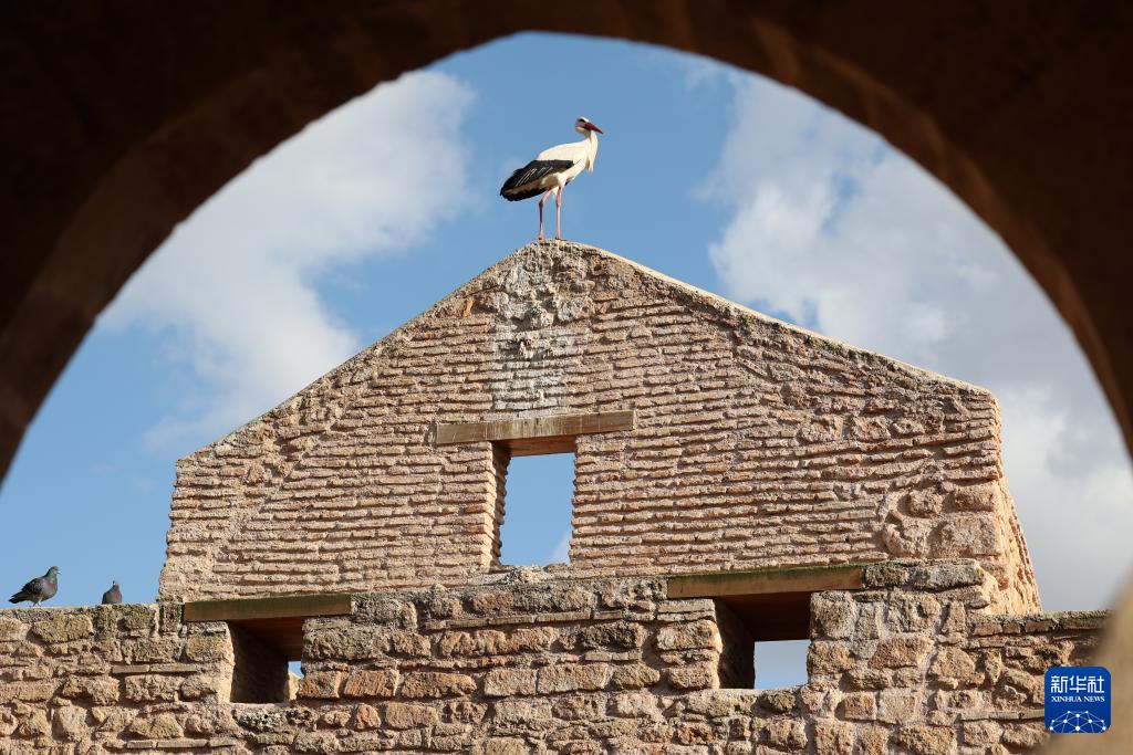 这是2月16日在摩洛哥首都拉巴特拍摄的栖居在舍拉考古遗址的鹳鸟。