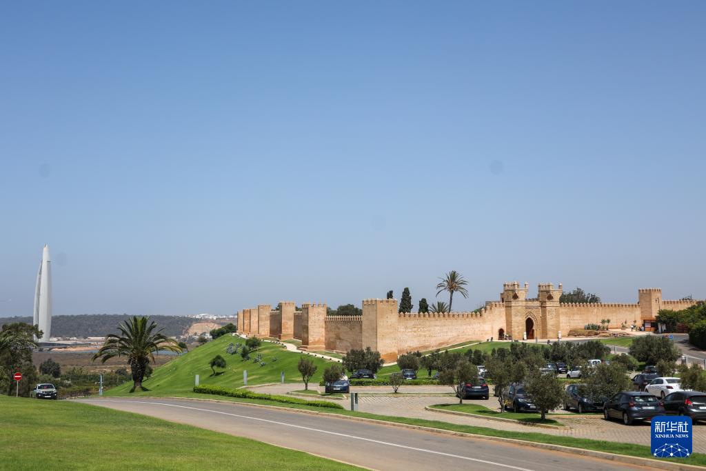 这是8月1日在摩洛哥首都拉巴特拍摄的舍拉考古遗址(右)和穆罕默德六世塔。