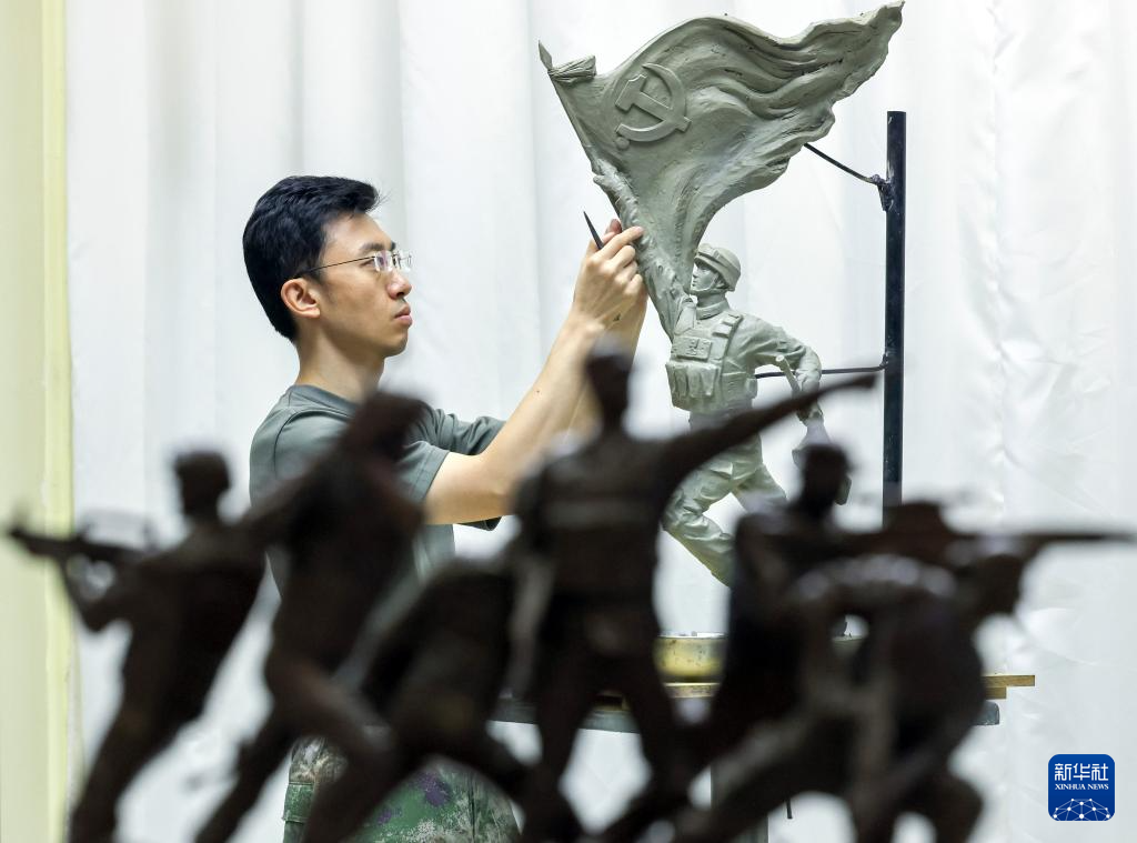 7月24日,国防大学军事文化学院副教授王树山在进行雕塑创作。