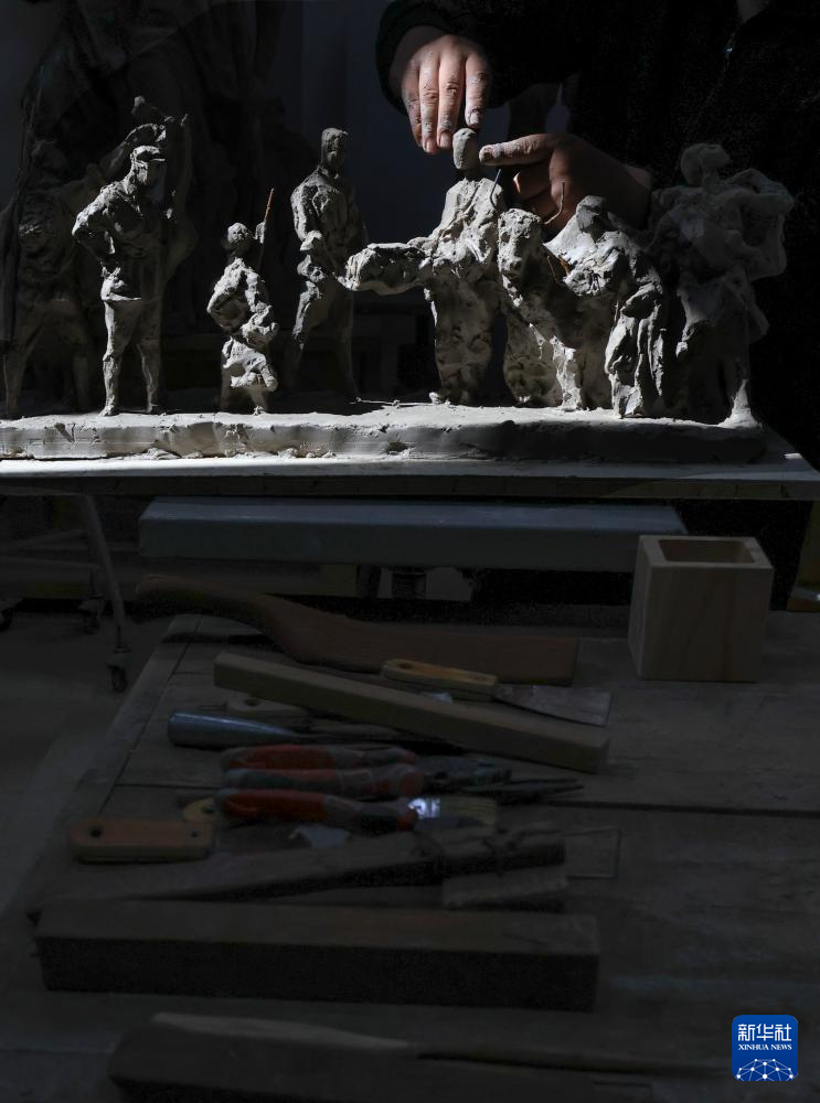 7月17日,中国人民革命军事博物馆创作员谈强在进行雕塑创作。