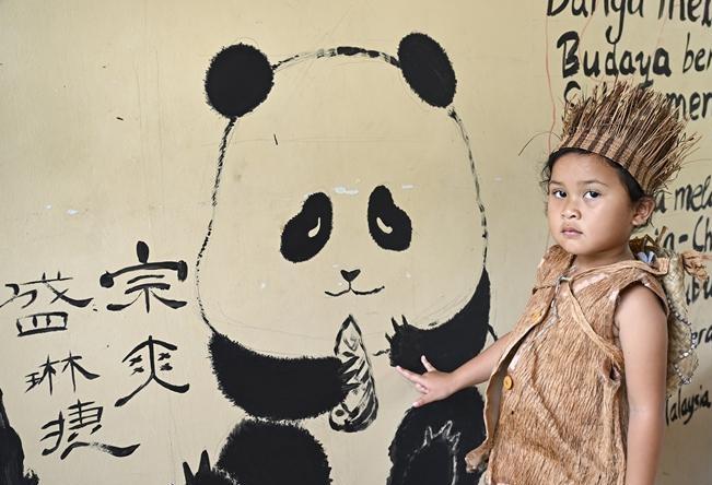 马来西亚当地原住民小朋友与壁画合影。记者 程一恒 摄