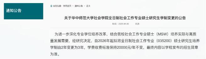今年6月30日,华中师范大学发布《关于华中师范大学社会学院全日制社会工作专业硕士研究生学制变更的公告》,其中明确提到,自2026年起拟将全日制社会工作专业(035200)硕士研究生培养学制由2年变更为3年。