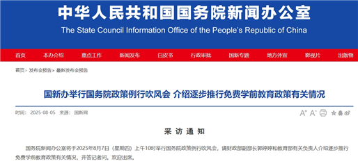 据国新网发布,国务院新闻办公室将于2025年8月7日(星期四)上午10时举行国务院政策例行吹风会,请财政部副部长郭婷婷和教育部有关负责人介绍逐步推行免费学前教育政策有关情况,并答记者问。