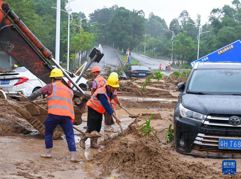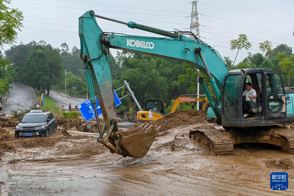 8月5日,救援机械在肇庆市端州区清理路面淤泥。