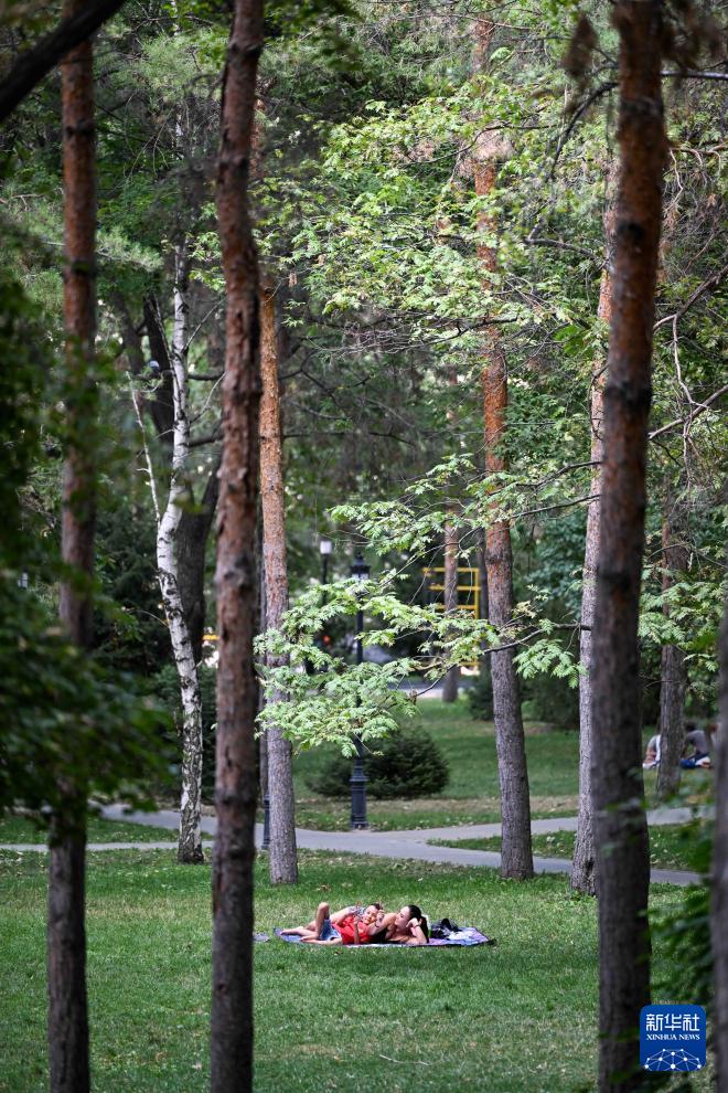 8月3日,在哈萨克斯坦阿拉木图,人们在一个公园内休闲纳凉。