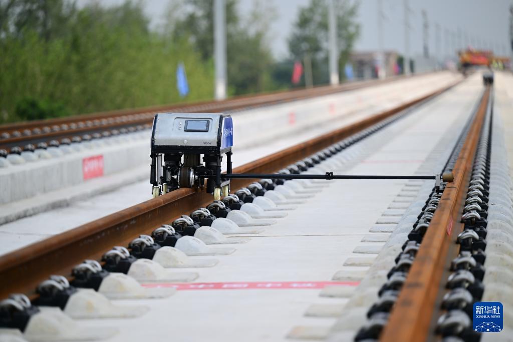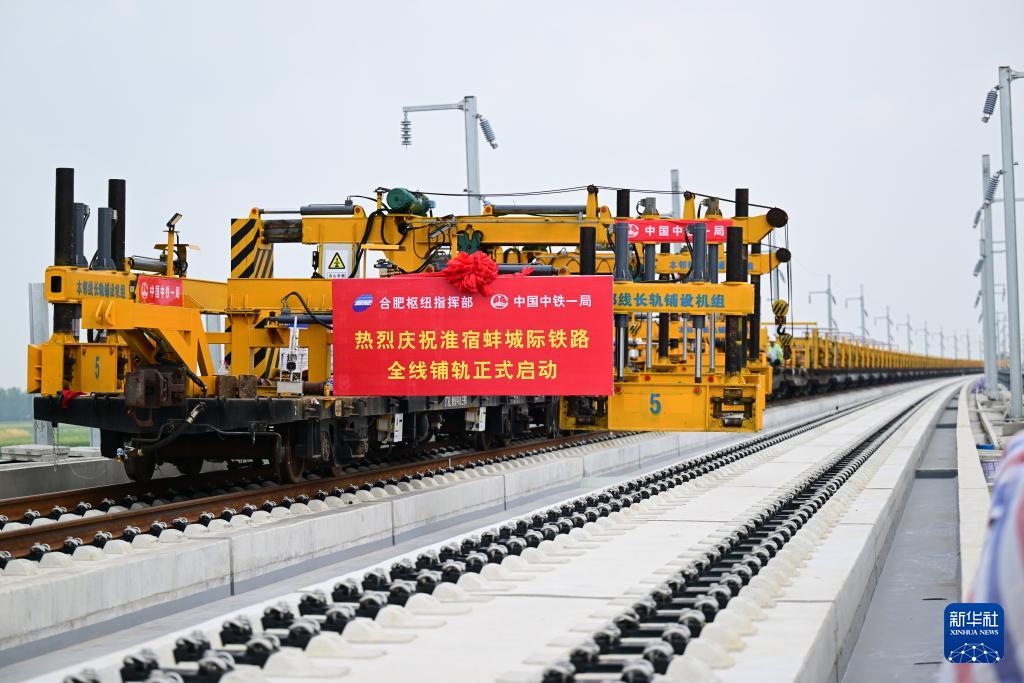 当日,在淮宿蚌城际铁路铺轨施工现场,中铁一局施工人员将首对500米长钢轨铺设在无砟轨道上,这标志着淮宿蚌城际铁路全线开始铺轨。