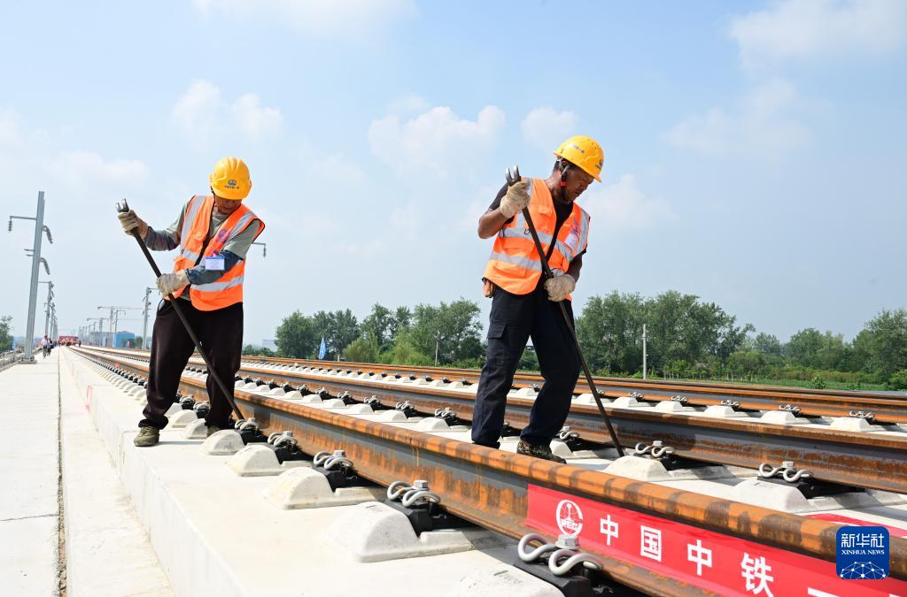 8月6日,中铁一局施工人员在淮宿蚌城际铁路铺轨施工现场作业。