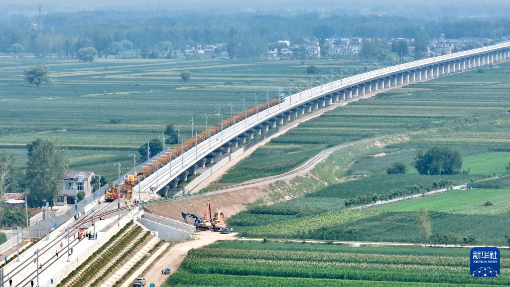 这是8月6日拍摄的淮宿蚌城际铁路铺轨施工现场。