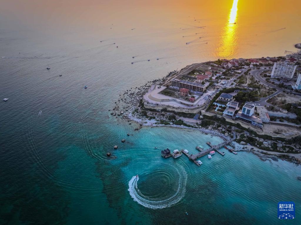 这是8月5日在哈萨克斯坦阿克套拍摄的日落时分的里海海滨风光(无人机照片)。