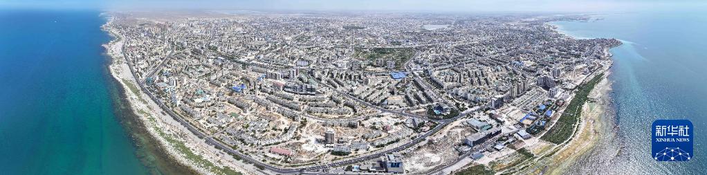 这是8月5日在哈萨克斯坦阿克套拍摄的城市景观(无人机全景合成照片)。