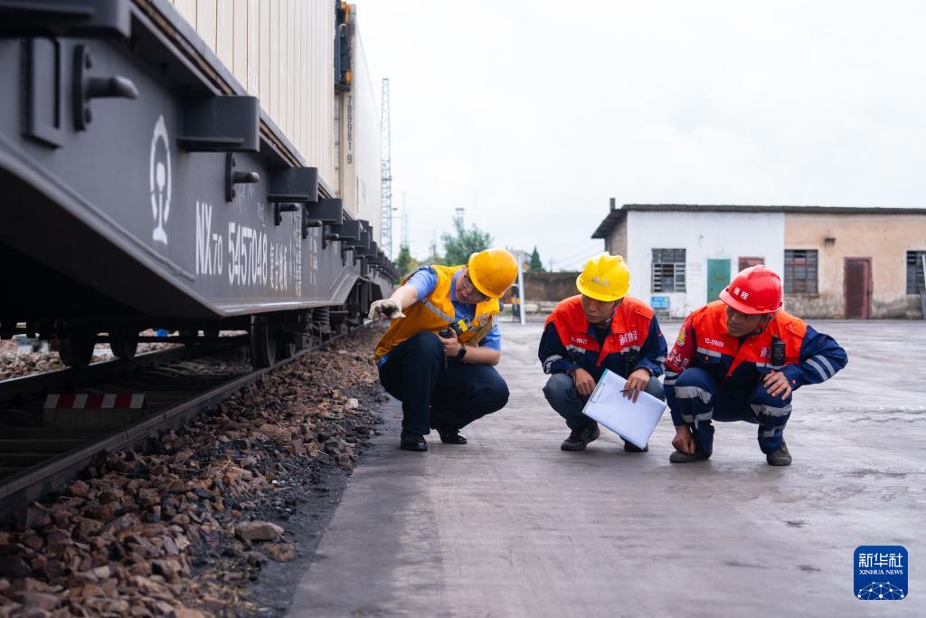 8月7日,工作人员在陆良站货场检查“陆良蔬菜号”冷链班列车体。