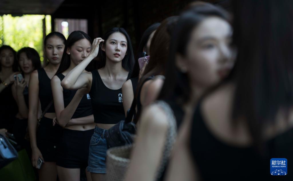 8月7日,在北京798·751园区举办的2025中国国际时装周(秋季)模特大面试上,模特在等待上场时走台步。