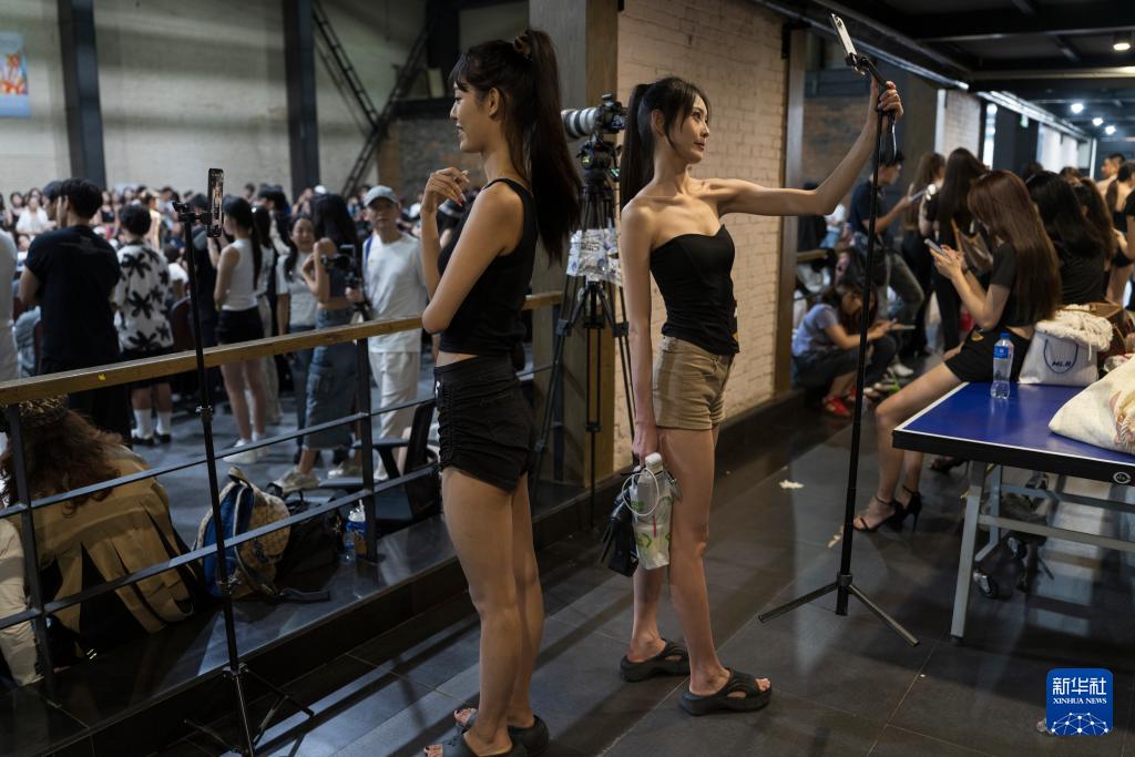 8月7日,在北京798·751园区举办的2025中国国际时装周(秋季)模特大面试上,模特在等待上场时用自媒体软件直播。
