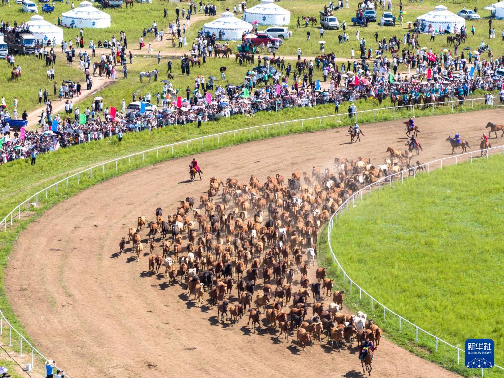 8月7日,游客在农牧民那达慕大会上观看跑马表演(无人机照片)。