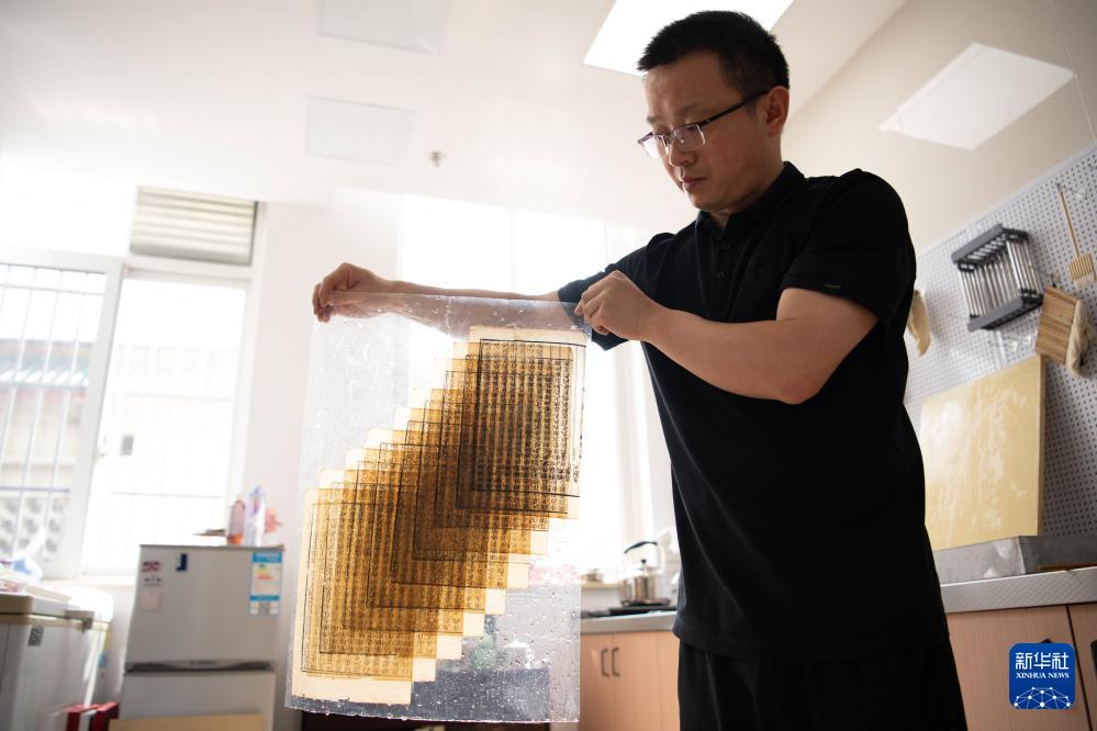 6月24日,在安徽省图书馆内,古籍修复师臧春华展示清洗后的书叶。