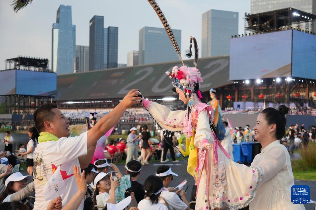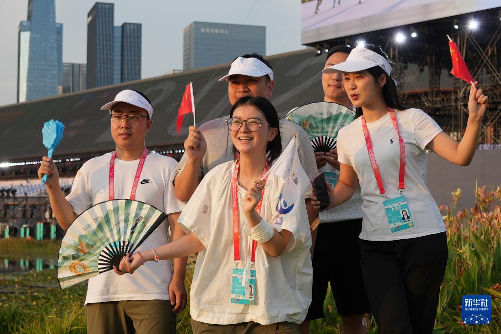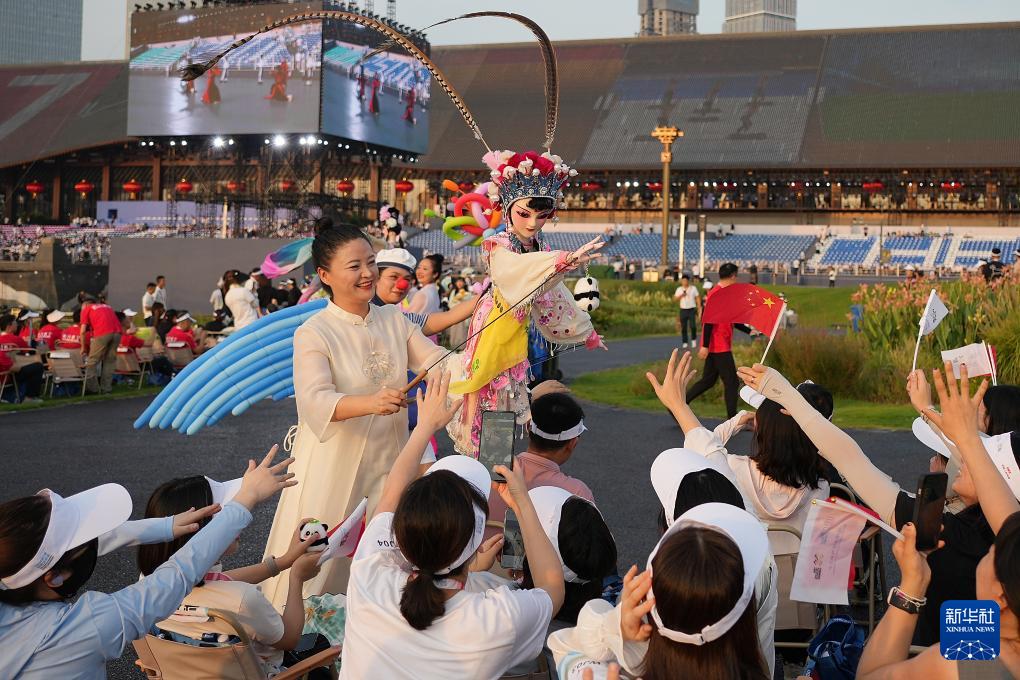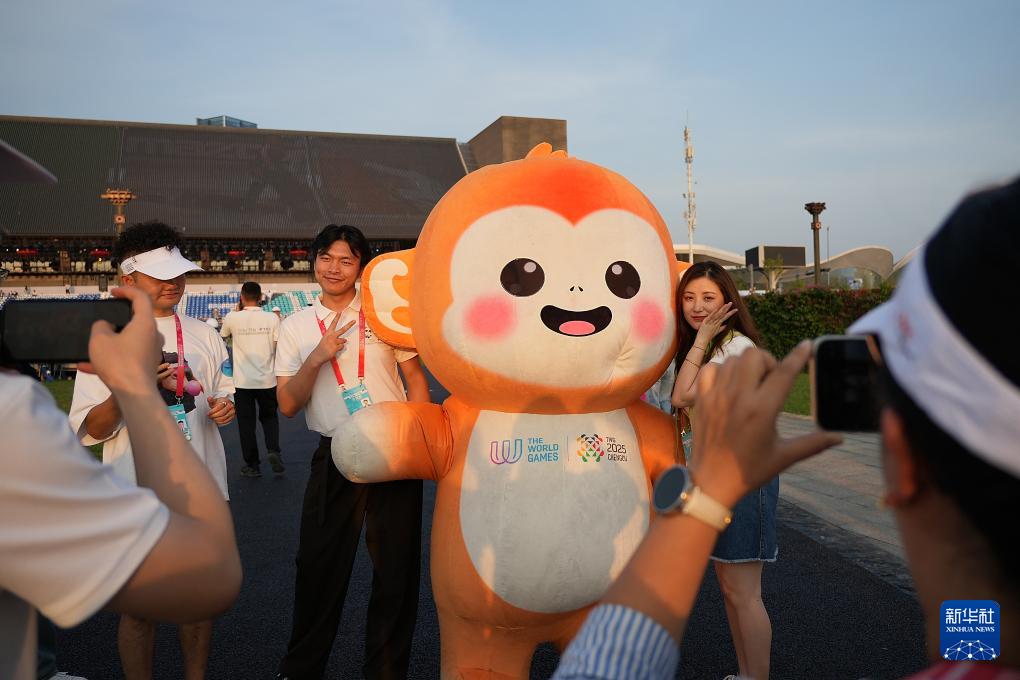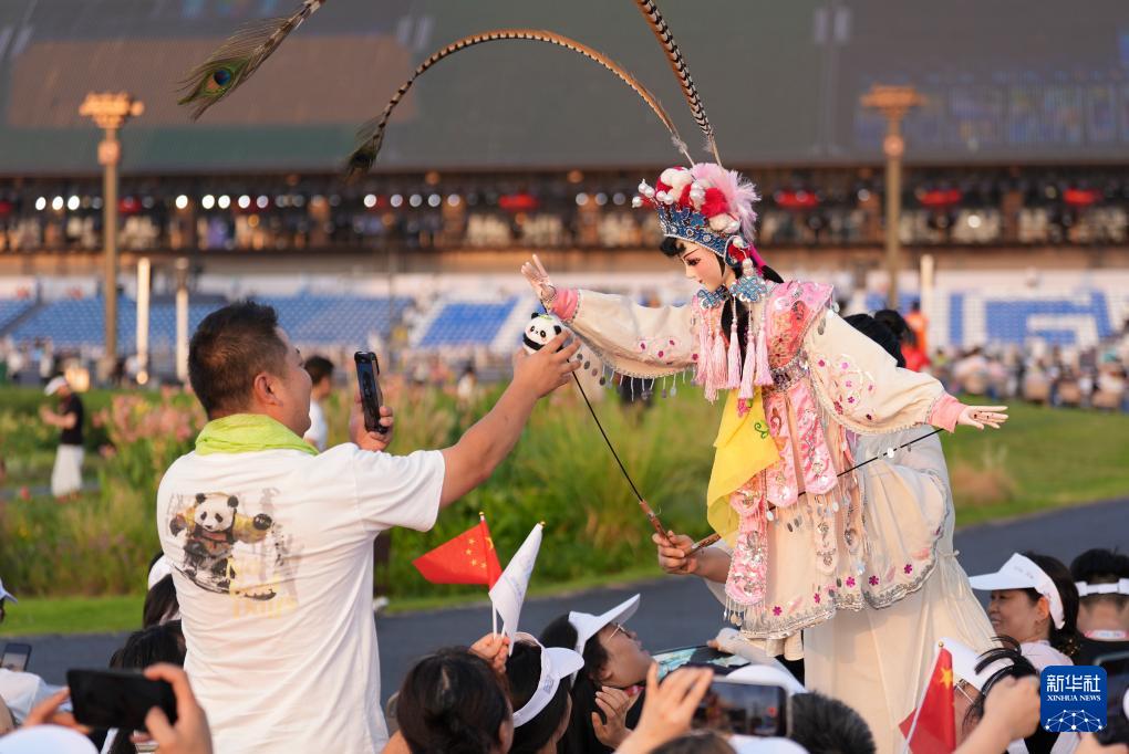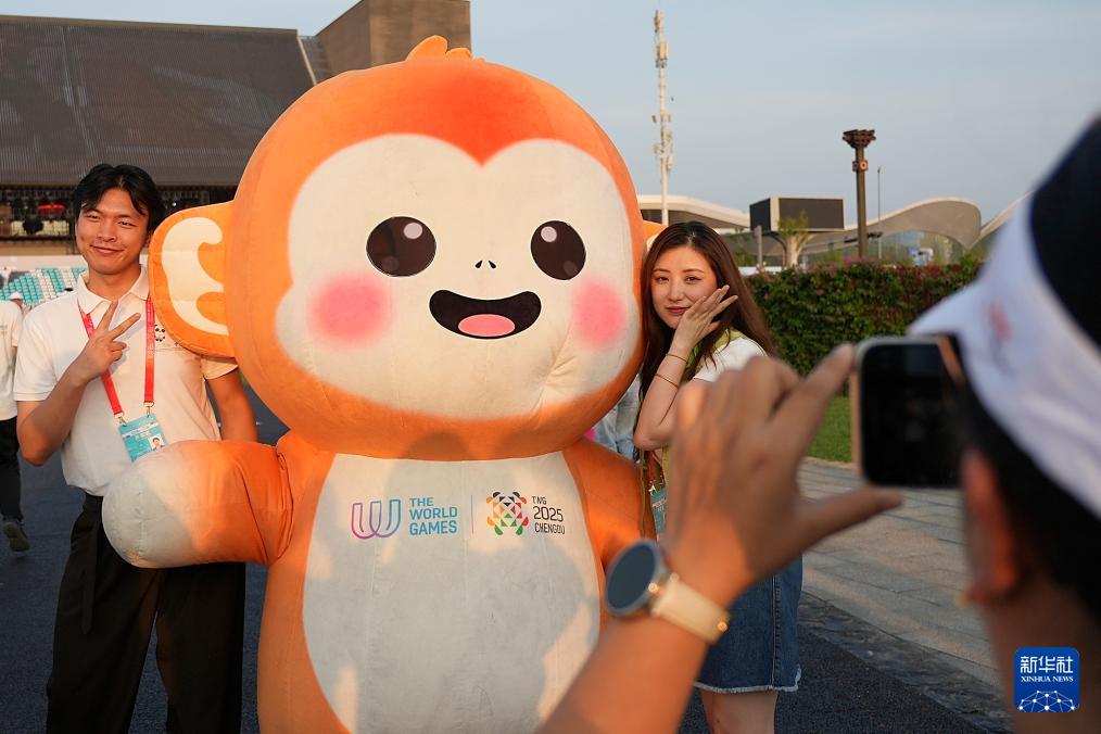 8月7日,观众在开幕式前与吉祥物"锦仔"合影。