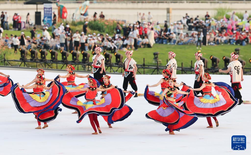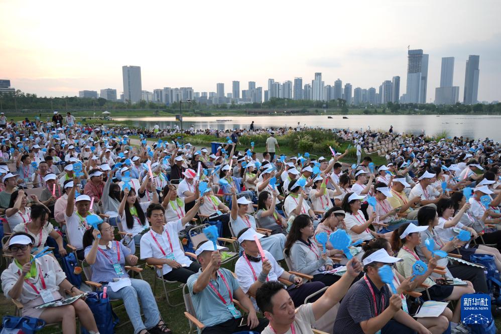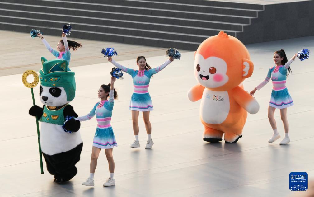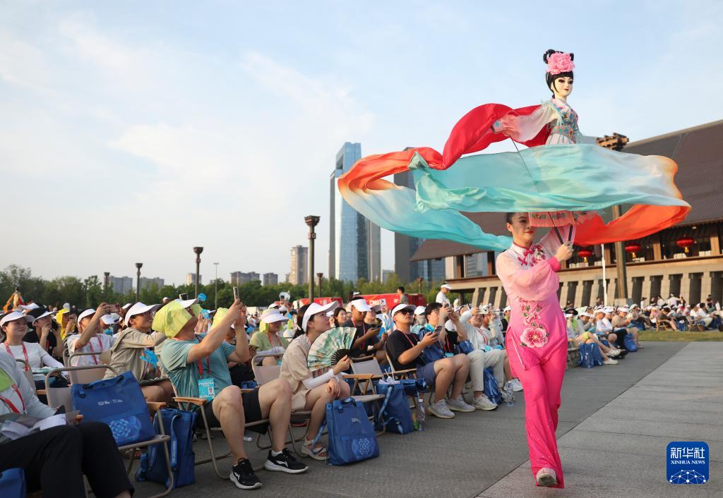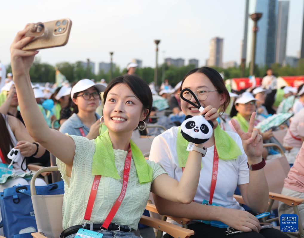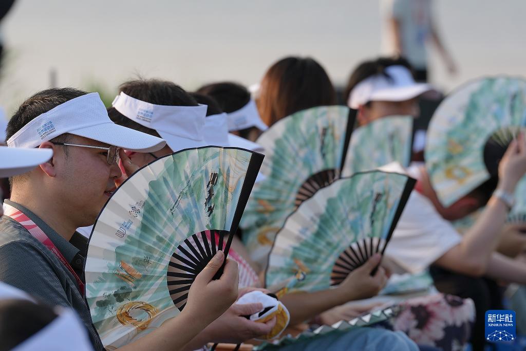 8月7日,观众在开幕式前与吉祥物"锦仔"合影。