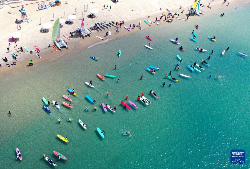 8月10日,游客在三亚市后海村附近海域冲浪嬉水(无人机照片)。