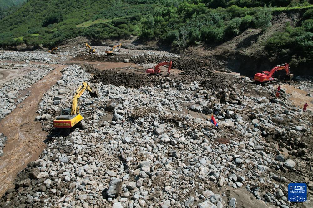 8月11日,在榆中县马坡乡阳屲山村,中国安能救援队使用挖掘机疏通清理山洪冲下的石头(无人机照片)。