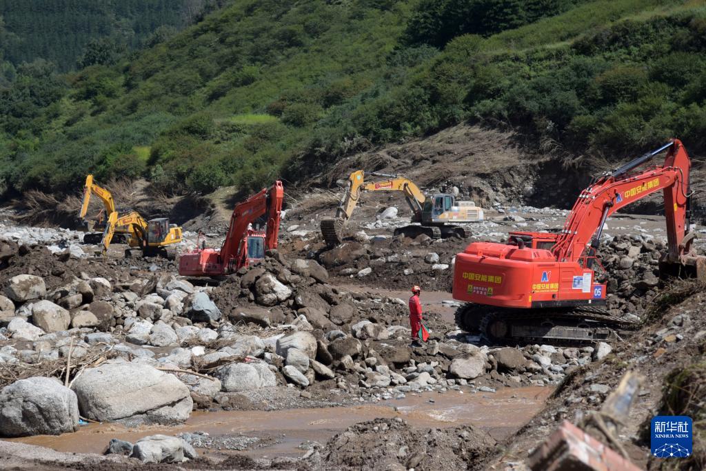 8月11日,在榆中县马坡乡阳屲山村,中国安能救援队使用挖掘机疏通清理山洪冲下的石头。