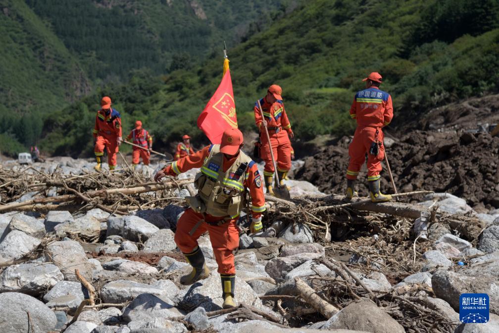 8月11日,在榆中县马坡乡阳屲山村,兰州市消防救援支队救援人员开展清理搜寻工作。
