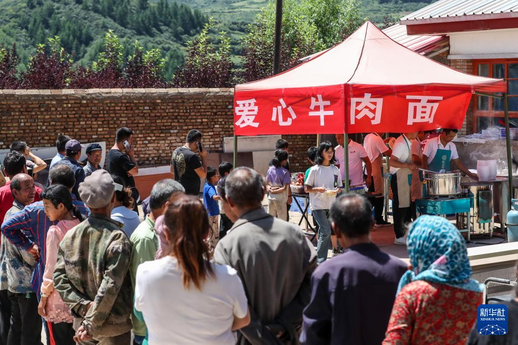 8月11日,在榆中县马坡乡上庄村临时安置点,受灾群众有序领取午餐。