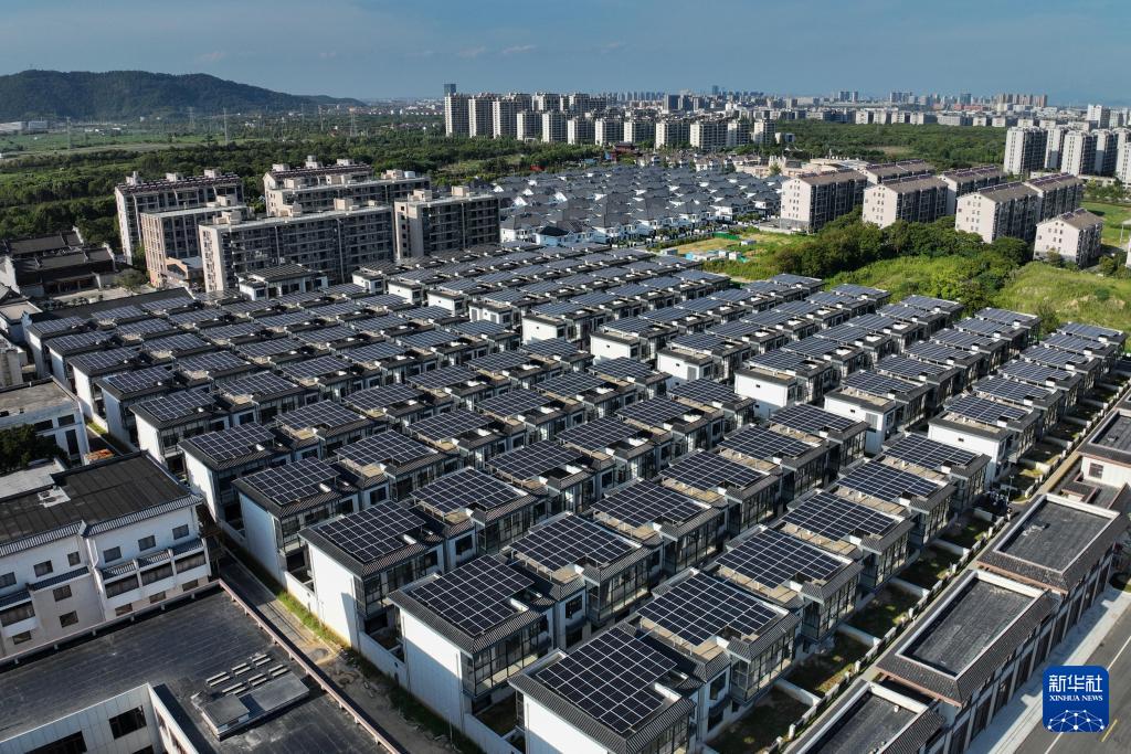 8月12日拍摄的宁波奉化萧王庙街道滕头未来社区屋顶分布式光伏发电项目(无人机照片)。